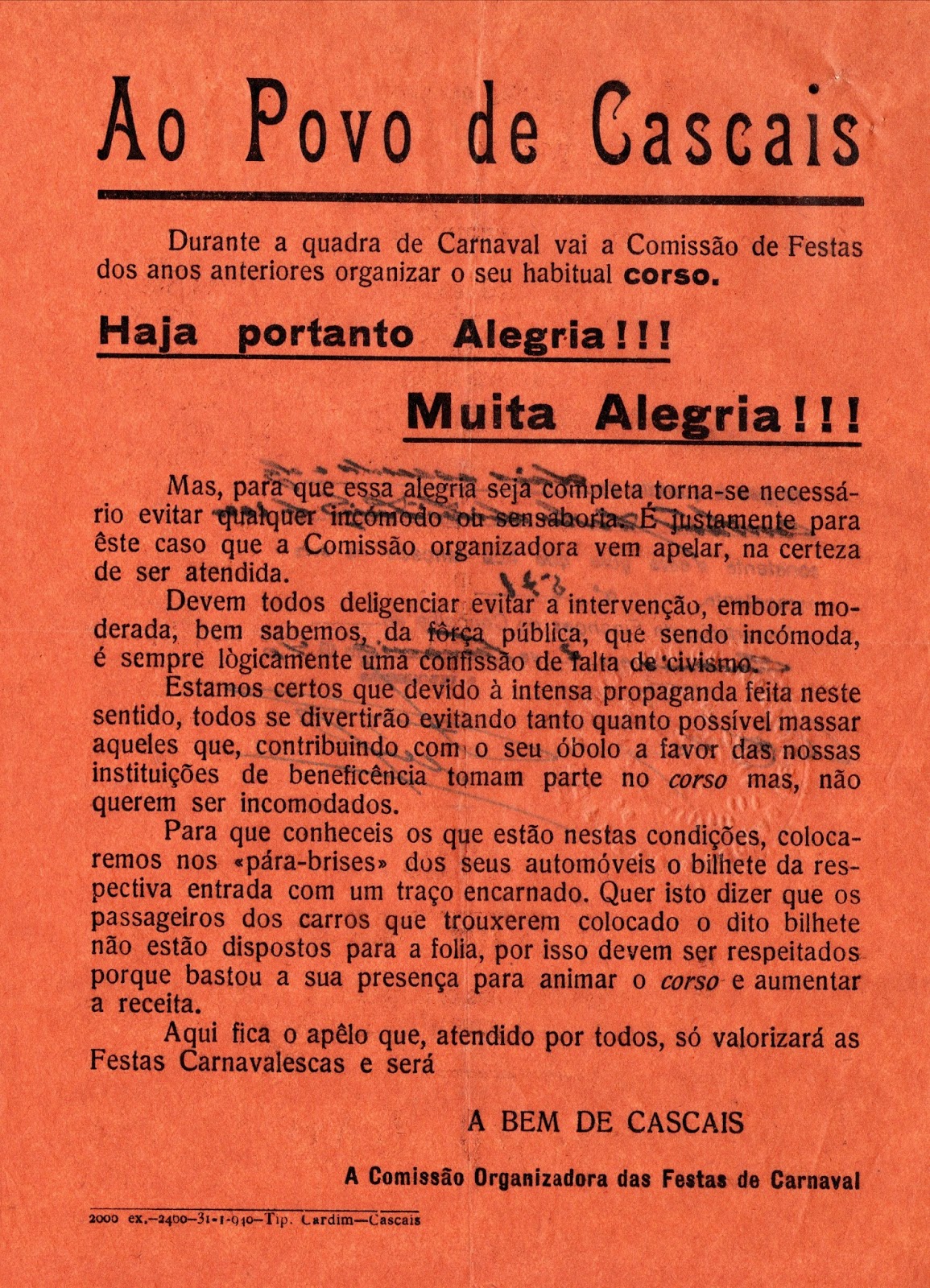 O Carnaval foi sempre uma das festas tradicionais de Cascais. Desde tempos imemoráveis, mas principalmente depois do desenvolvimento que resultou da chegada da corte para o final do estio, em 1870, o Domingo e a Terça-feira de Carnaval eram sinónimo de festa, brincadeiras e de um clima generalizado de boa disposição que envolviam as ruas e as pessoas que moravam em Cascais. Nesses outros Carnavais, eram as instituições de Cascais e os Cascalenses que as dirigiam, quem organizava os desfiles, os bailes e as demais tropelias que davam forma ao carnaval na nossa terra. Desde 1939, quando foi criada pela mão de Nunes do Santos, Florindo de Oliveira e, mas tarde, por Armando Vilar e Joaquim Aguiar, que a Sociedade Propaganda de Cascais começou a liderar a organização das festas, dando corpo a um conjunto de iniciativas nas quais participavam, de forma directa e indirecta, quase todos os Cascalenses.