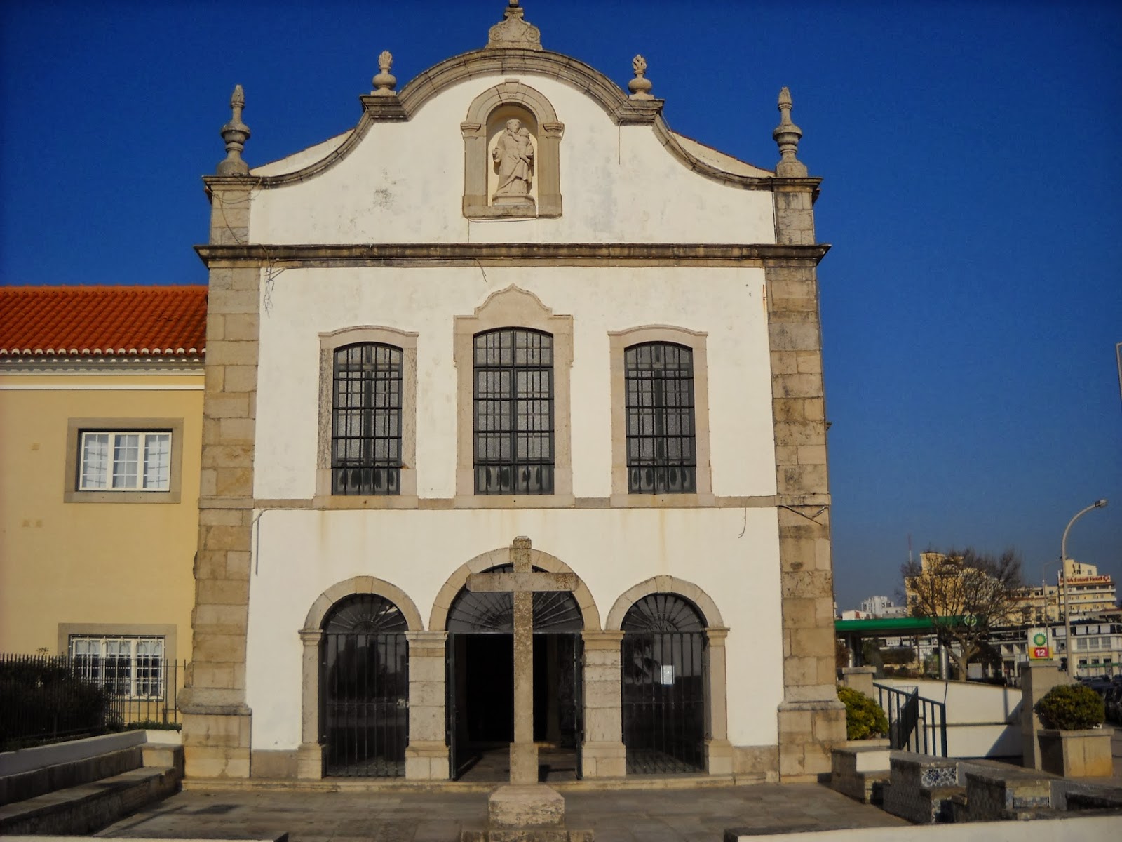 Pertença do Dr. Luís da Maia, clérigo do hábito de São Pedro, o terreno onde veio a instalar-se o convento, possuía já uma pequena capela dedicada a São Roque, mandada construir alguns anos antes, em data não determinada, por Leonor Fernandes, moradora no Casal do Estoril. O momento em que o ilustre prelado oferece o terreno à Ordem, que o recebe pela mãos de Rodrigo de Sant’Iago, é precisamente aquele que marca o início do processo de construção do idílio conventual, para o qual se utilizaram, trazidas do derruído Convento de Enxombregas, as pedras que vieram a consolidar as suas paredes. A direcção das obras assumidas por Rodrigo de Sant’Iago foi de tal modo perene, que depressa se concluiu a construção do novo templo que, composto por uma única nave, possuía no entanto três altares, onde se prestava culto à imagem de Nossa Senhora da Boa Nova, a São Domingos e a São Francisco. Segundo a ‘Crónica Seráfica da Santa Província dos Algarves’, na qual se descrevem os edifícios da Ordem de São Francisco, existiria ainda uma imagem de Santo António ao lado da epístola, no altar-mor, que possivelmente seria datável de um momento anterior à edificação do edifício.